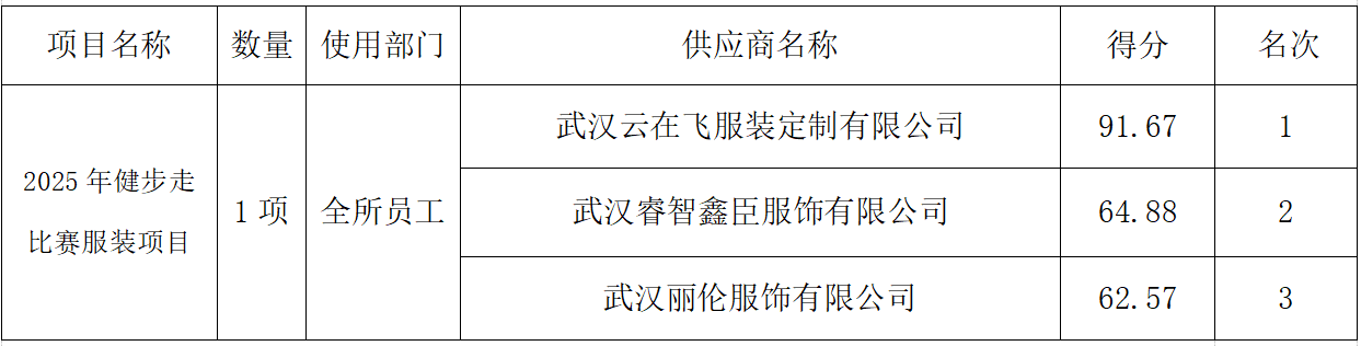武汉产品质量检验所有限公司工会小组于2025年1月24日上午,组织了“健步走比赛服装采购项目”采购竞争性谈判,结果公示如下: